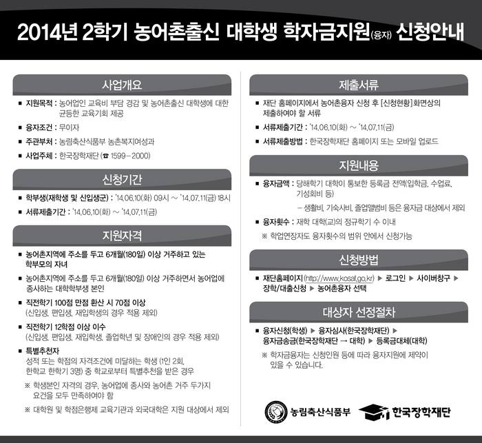 한국장학재단에서 주관하는 2014학년도 2학기 농어촌학자금대출 신청을 아래와 같이 안내합니다.