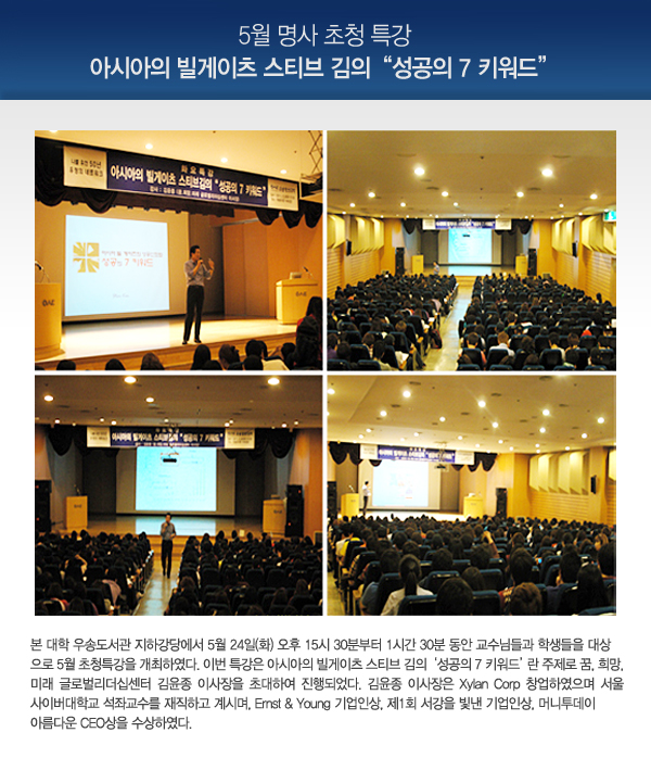 대학광장 공지사항 코로나19 공지사항 혁신지원사업단 RISE 사업단 공지사항 새소식 보도자료 학과별 명장 Story 상담 및 건의함 입찰정보 동캠퍼스 체육관 대여 신청 동캠퍼스 운동장 대여 신청 새소식 홈 대학광장 새소식 5월 명사 초청 특강 아시아의 빌게이츠 스티브 김의“성공의 7 키워드” 카테고리 : | 작성자 : 관리자 | 작성일 : 2011.05.25 | 조회수 : 6,792 첨부파일 1306282323_110525.jpg 304.jpg 목록