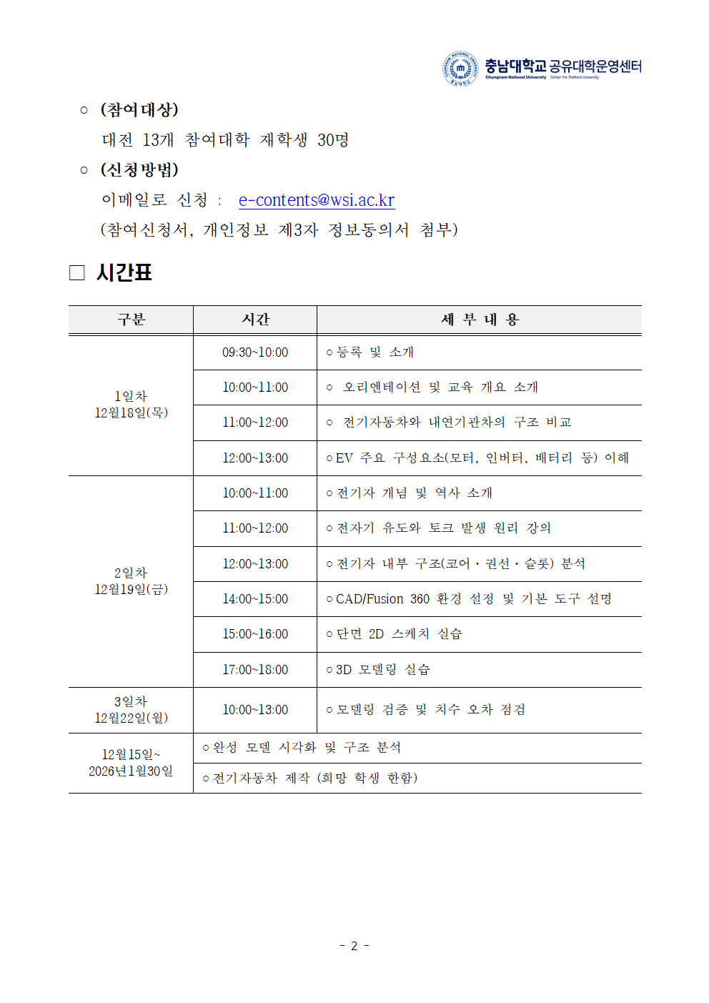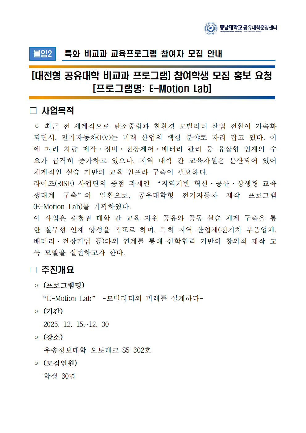 대학광장 공지사항 코로나19 공지사항 혁신지원사업단 RISE 사업단 공지사항 새소식 보도자료 학과별 명장 Story 상담 및 건의함 입찰정보 동캠퍼스 체육관 대여 신청 동캠퍼스 운동장 대여 신청 RISE 사업단 공지사항 홈 대학광장 RISE 사업단 공지사항 [대전형 공유대학 비교과 프로그램] 참여학생 모집 홍보 요청 [프로그램명: E-Motion Lab] 카테고리 : | 작성일 : 2025.12.08 | 조회수 : 1,021 하단의 첨부 파일(특화 비교과 교육프로그램 참여자 모집 안내) 을 작성→ mailto:e-contents@wsi.ac.kr 클릭 → G-mail로 제출 ※ 아래의 첨부파일 (특화 비교과 교육프로그램 참여자 모집 안내)을 작성해서 해당 G-mail을 통해 제출해주시기 바랍니다 첨부파일 [1]모집 요청서.bmp [1]모집요청서 2.bmp 특화 비교과 교육프로그램 참여자 모집 안내.hwp 목록
